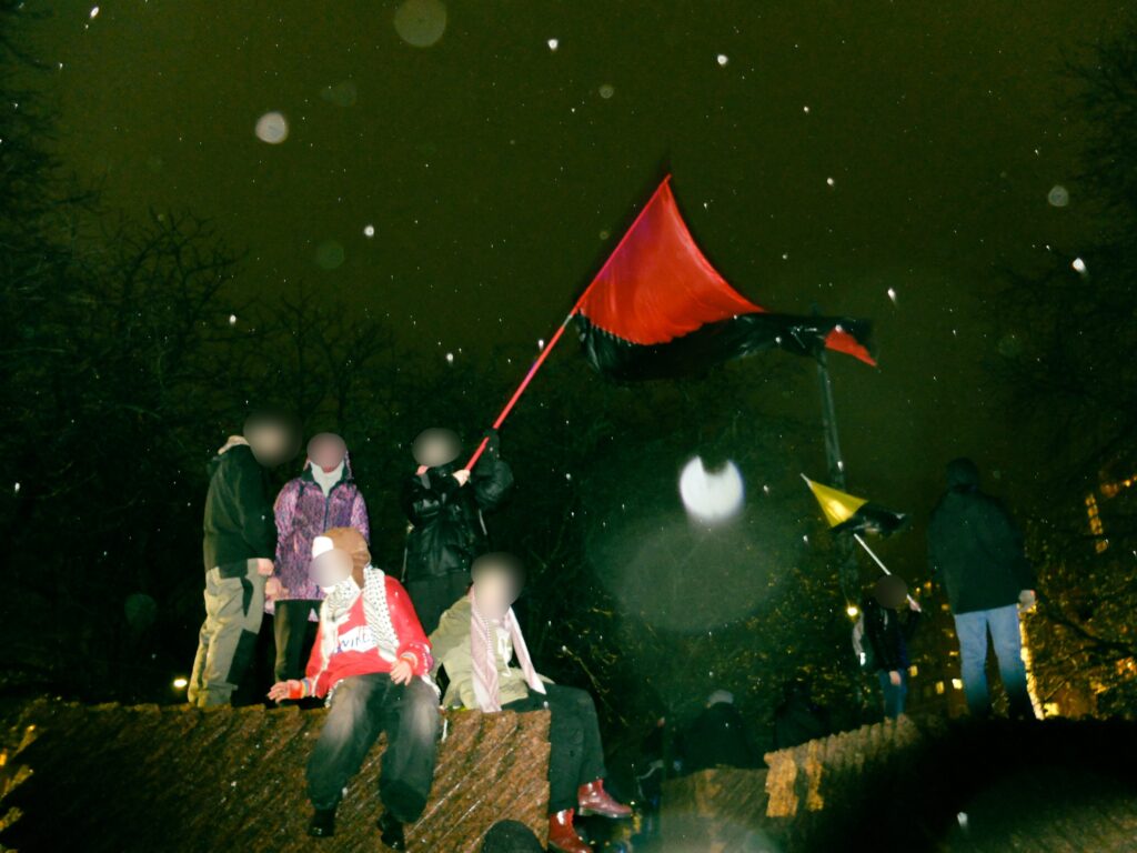 De sista två timmarna spenderades i ett låst läge på rönninge torg med bibehållen god stämning. Vi sjöng kampsånger och glatt hånade både polisen och nazisterna. De flesta kamrater som snuten fick tag på släpptes ganska kort inpå demoslutet. En kamrat lyckades vi fånga tillbaka innan snuten fick vantarna på dem.